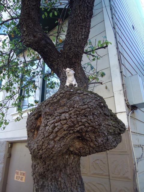 This porcelain bull was placed on a tree to watch pedestrian below.