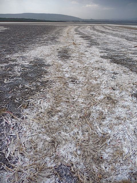 Endless piles of flamingo feathers testified to their earlier abundance in this lake. The drought reduced water flow into this salt lake and the lake dried up. Most of the flamingoes left for an adjacent lake to feed and live.