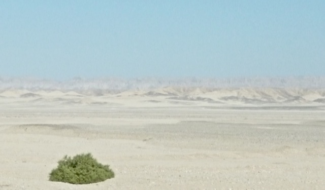 In the desert, a lone shrub is a dot of green in a barren sea of sand.