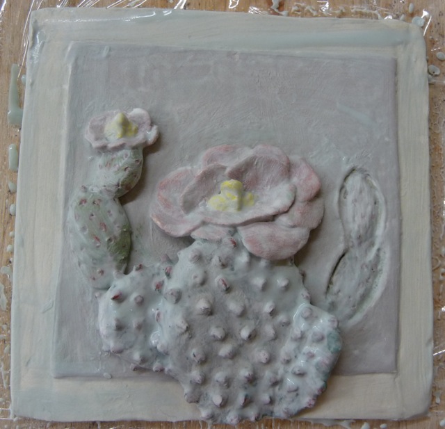 For the last few months, I concentrated on making tiles with flowers. I fashion pieces of clay and paste them to a slab to form flowers and leaves. This is a ginger flower ( 薑花). After thorough drying, this piece is fired to form a hard bisque.