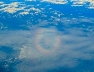 From the airplane and with the sun behind me, I looked down on the clouds below and saw a circular rainbow cast on the wispy clouds. If the clouds were closer to the airplane, I would have seen the shadow of the plane in the center of the circle. This is a nice reward for my hours of looking out of airplane windows when I travel.