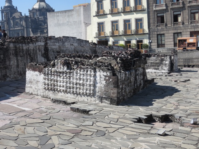 The Spanish demolished Templo Mayor and used the stones to build its cathedrals and houses. This picture superimposes an image of Templo Mayor on today’s city scape next to the National Palace and the Metropolitan Cathedral. For centuries, the only remainder of this temple was a mound of rubbles called the Island of the Dogs where street dogs sought refuge during floods.
